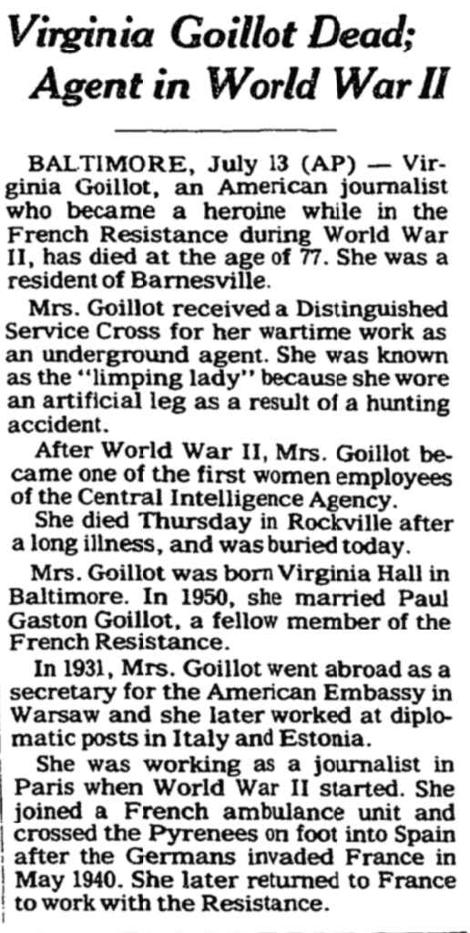 “Gung-ho lady left over from OSS days overseas. Young women in sweater sets and pearls listened raptly to Virginia Hall gas with muscular paramilitary officers who would stop by her desk to tell war stories. She was elegant, her dark brown hair coiled on top of her head with a yellow pencil tucked into the bun. She was always jolly when she was around the old boys. She was a presence!”